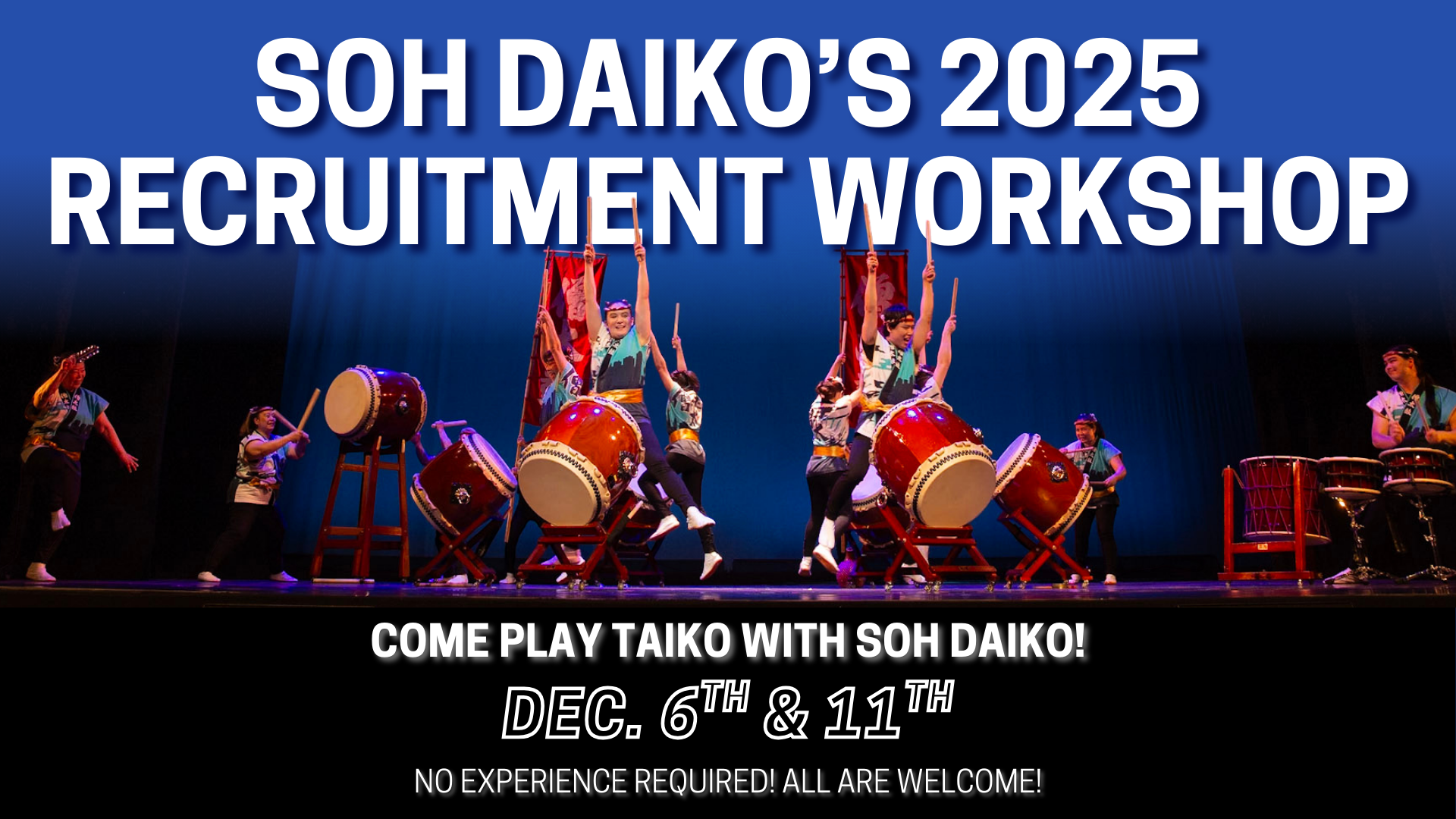 Soh Daiko is pleased to offer a public recruitment workshop that will span two dates this December. Learn to play taiko and try out to be a member of the group! No experience is necessary. We will provide everything you need to play.